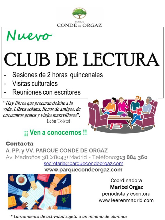 Los interesados en apuntarse a nuestro Club de Lectura lo pueden hacer a través de los canales de la asociación: secretaria@parquecondeorgaz.com, teléfono 913884360 o, por supuesto, nuestra página de contacto en esta web. Aquí os informarán al detalle de esta actividad, horarios, precios, etc. Esta actividad está sujeta a que haya un número mínimo de participantes